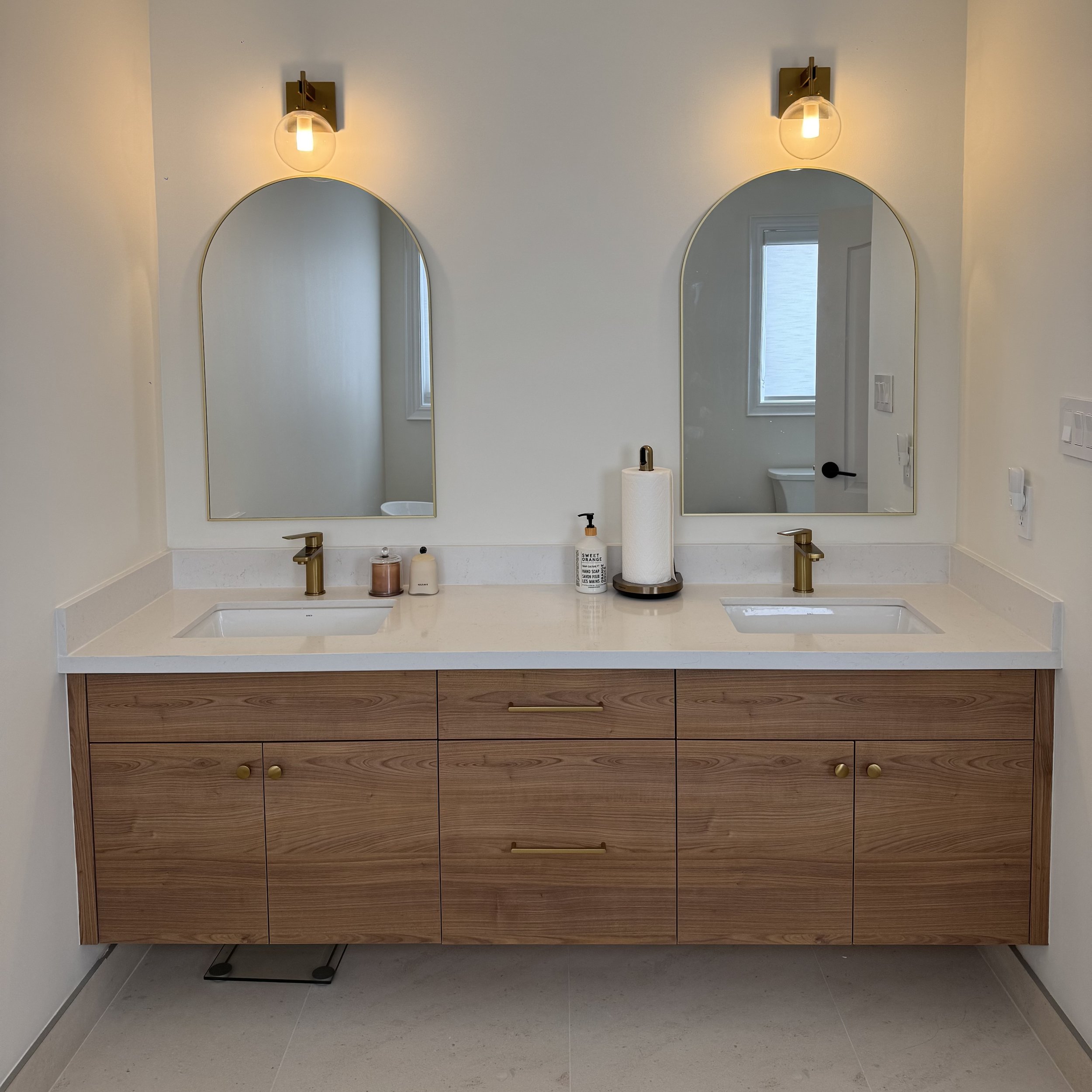 Every vanity layout is planned to maximize storage and workflow within the footprint available. Whether the project calls for a floating double vanity, a built-in linen cabinet, or a fully custom storage configuration, we coordinate style, material, hardware, and plumbing to deliver a clean, functional result.
